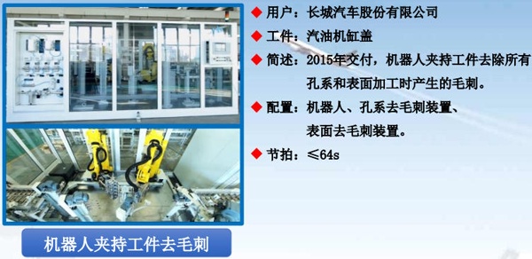 4 配置:工业机器人、末端夹持系统、去毛刺工具、控制系统、工件定位与检测、安全防护系统。